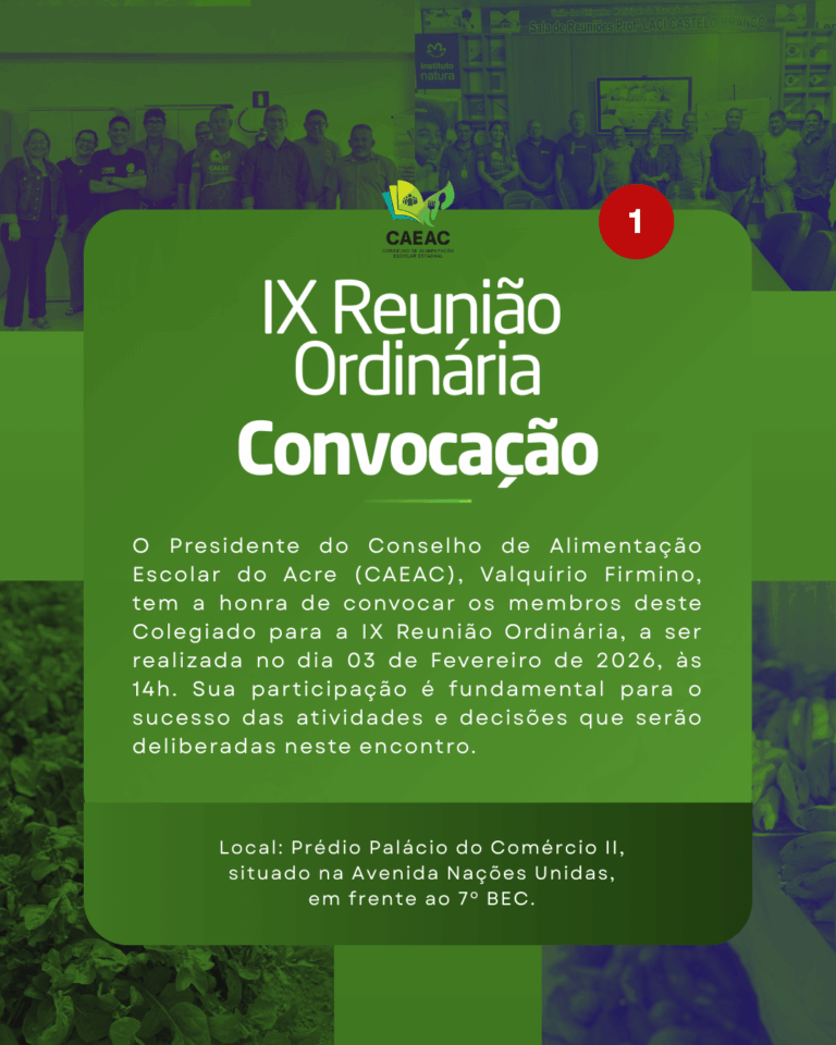 O Presidente do Conselho de Alimentação Escolar do Acre (CAEAC), Valquírio Firmino, tem a honra de convocar os membros deste Colegiado para a IX Reunião Ordinária, a ser realizada no dia 03 de fevereiro de 2026, às 14h, nas dependências do Novo prédio da SEE, localizado na Avenida Nações Unidas, Nº 1955 – Bairro Estação Experimental, em frente ao 7º BEC (Nome do prédio: Palácio do Comércio II)