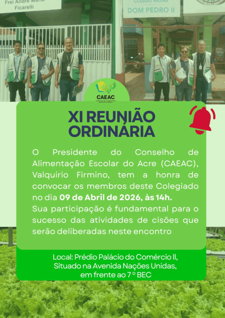 O Presidente do Conselho de Alimentação Escolar do Acre (CAEAC), Valquírio Firmino, tem a honra de convocar os membros deste Colegiado para a XI Reunião Ordinária, a ser realizada no dia 09 de abril de 2026, às 14h, nas dependências do Novo prédio da SEE, localizado na Avenida Nações Unidas, Nº 1955 – Bairro Estação Experimental, em frente ao 7º BEC (Nome do prédio: Palácio do Comércio II)